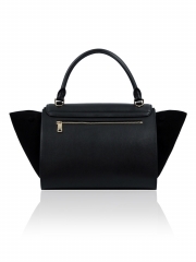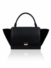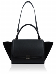Кожаная сумка Trapeze CELINE имеет интересное, привлекающее внимание, сочетание цветов и фактур. На черном основании из гладкой кожи располагается бежевый кожаный клапан. Боковые стороны выполнены из зеленой замши. Они преобразуют прямоугольную форму сумки в трапецию. Бежевая гладкая ручка дополняется съемным длинным ремешком. Застегивается эта модель на два замка. Чтобы получить доступ к содержимому, нужно сначала открыть золотистую защелку, верхняя часть которой откидывается вниз. Под клапаном расположена молния. Интерьер кожаный. Большое отделение дополнено внутренним кармашком. На наружной стороне имеется большой карман на молнии.